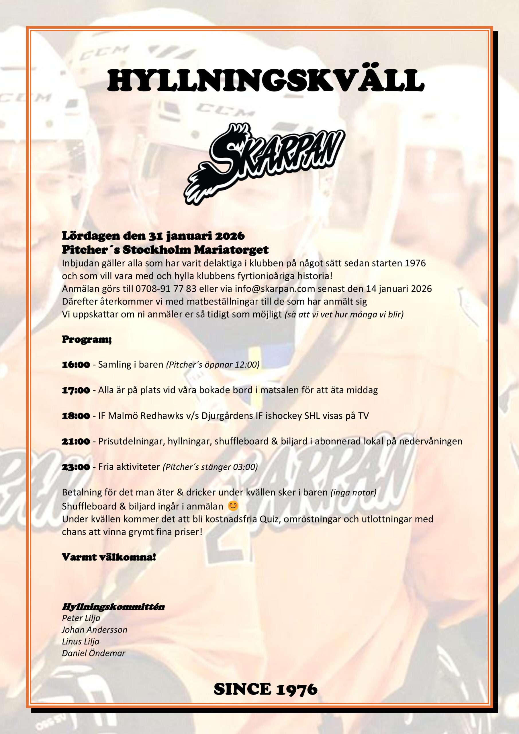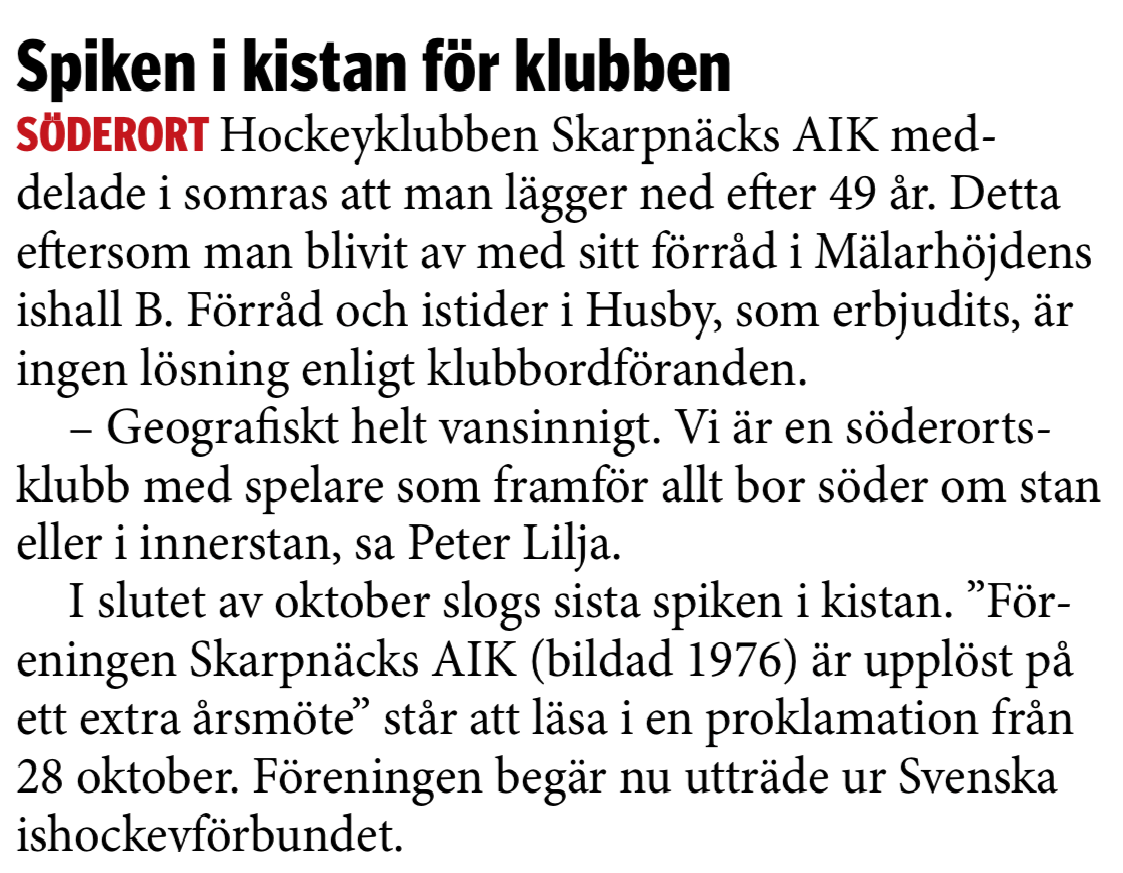 Idrottsförvaltningen i Stockholm Stad har gjort ett aktivt val att döda Skarpnäcks AIK efter fyrtionio raka säsonger genom att inte tillhandahålla klubben en förrådslösning i hemmaarenan evakueringshallen Mälarhöjdens Ishall B eller att tillhandahålla klubben en realistisk, fungerande lösning med både istider och förrådsutrymme i söderort utan förpassar klubben till Husby Ishall norr om staden.